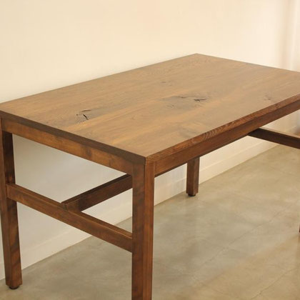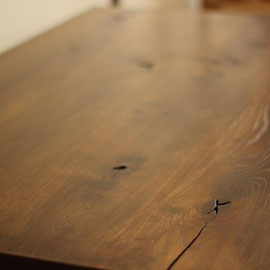 楢の節ありを使い、また古民家風というイメージのもと、濃い色に着色して、クリアー仕上げをしました。